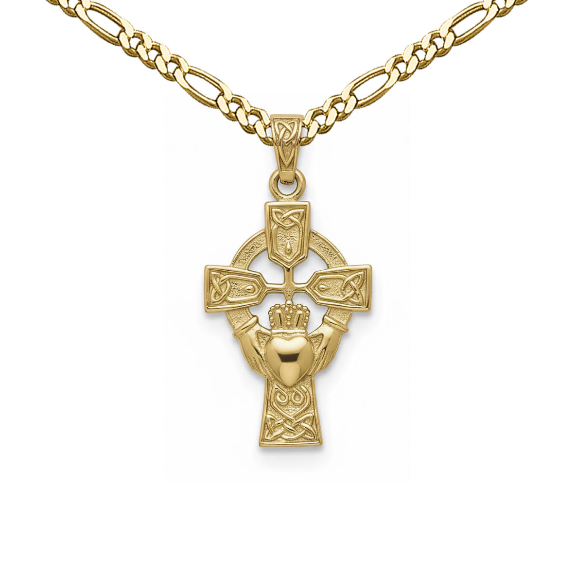 The Claddagh design features hands, a heart and a crown, representing friendship, love and loyalty. First created in Ireland in the 1600s, the Claddagh has been an enduring symbol of love and friendship for hundreds of years. This stunning pendant combines two traditional Irish symbols, the Claddagh and the Celtic cross, making a beautiful gift.