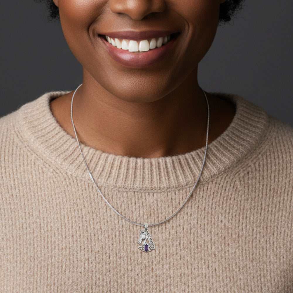 This elegant sterling silver pendant beautifully combines the spirited nature of the horse with deep Celtic artistry. The design showcases a majestic horse's head intricately detailed with sweeping lines, resting above a traditional Celtic knotwork pattern.