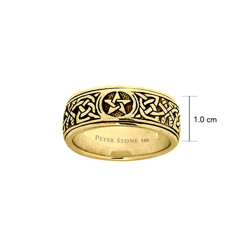 Centered within the knotwork is a circular frame containing a strong Five-Pointed Star (Pentacle/Pentagram). This central symbol serves as a powerful emblem of protection and the harmonious balance of the five elements (Spirit, Earth, Air, Fire, Water). The warm, classic tone of the yellow gold highlights the depth of the carving, making this ring a durable, aesthetically beautiful, and meaningful statement of spiritual grounding and enduring faith.