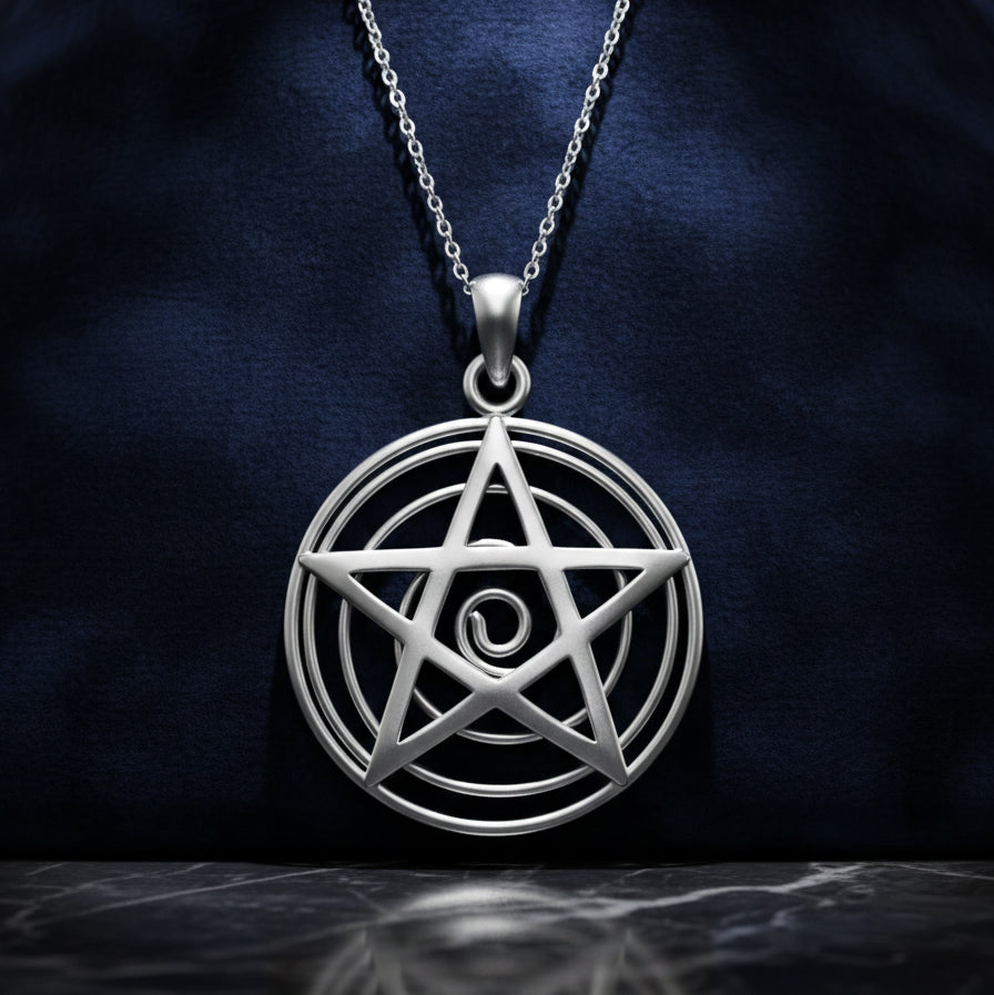 This sterling silver pendant features an intricately designed spiral pentacle, a symbol that merges geometric precision with spiritual significance. Crafted from authentic sterling silver, the piece showcases detailed metalwork with a polished finish that catches light beautifully. The spiral motif adds dynamic movement to the classic five-pointed star design, creating visual depth and sophistication. Ideal for those drawn to meaningful jewelry, this pendant works as a standalone statement piece or pairs seamlessly with your favorite chain. A versatile addition to any collection that values both craftsmanship and symbolism.