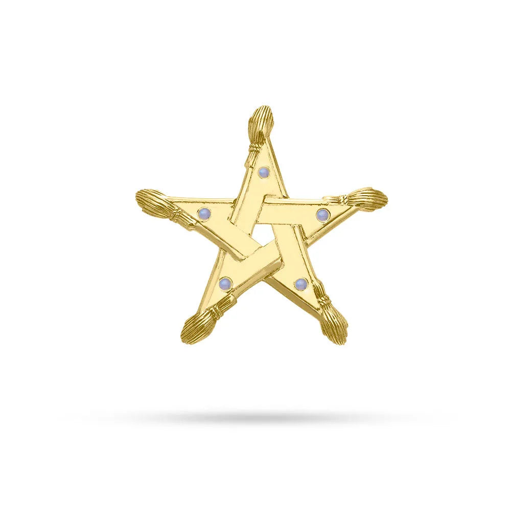 En este pentáculo wiccano, un palo de escoba y una piedra preciosa se combinan con cada punto cardinal, con una impresionante incrustación de oro.