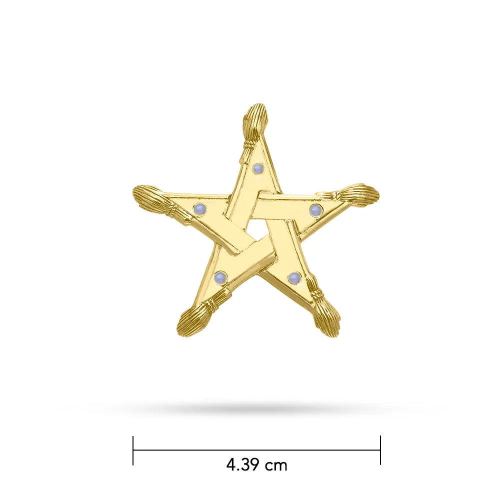 Colgante de escoba dorada GPD875 En este pentáculo wiccano, un palo de escoba y una piedra preciosa se combinan con cada punto cardinal, con una impresionante incrustación de oro. Peter Stone, el fabricante líder mundial de joyería fina de plata de ley y oro para la Wicca y el paganismo,...