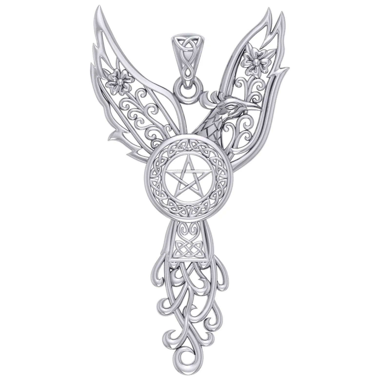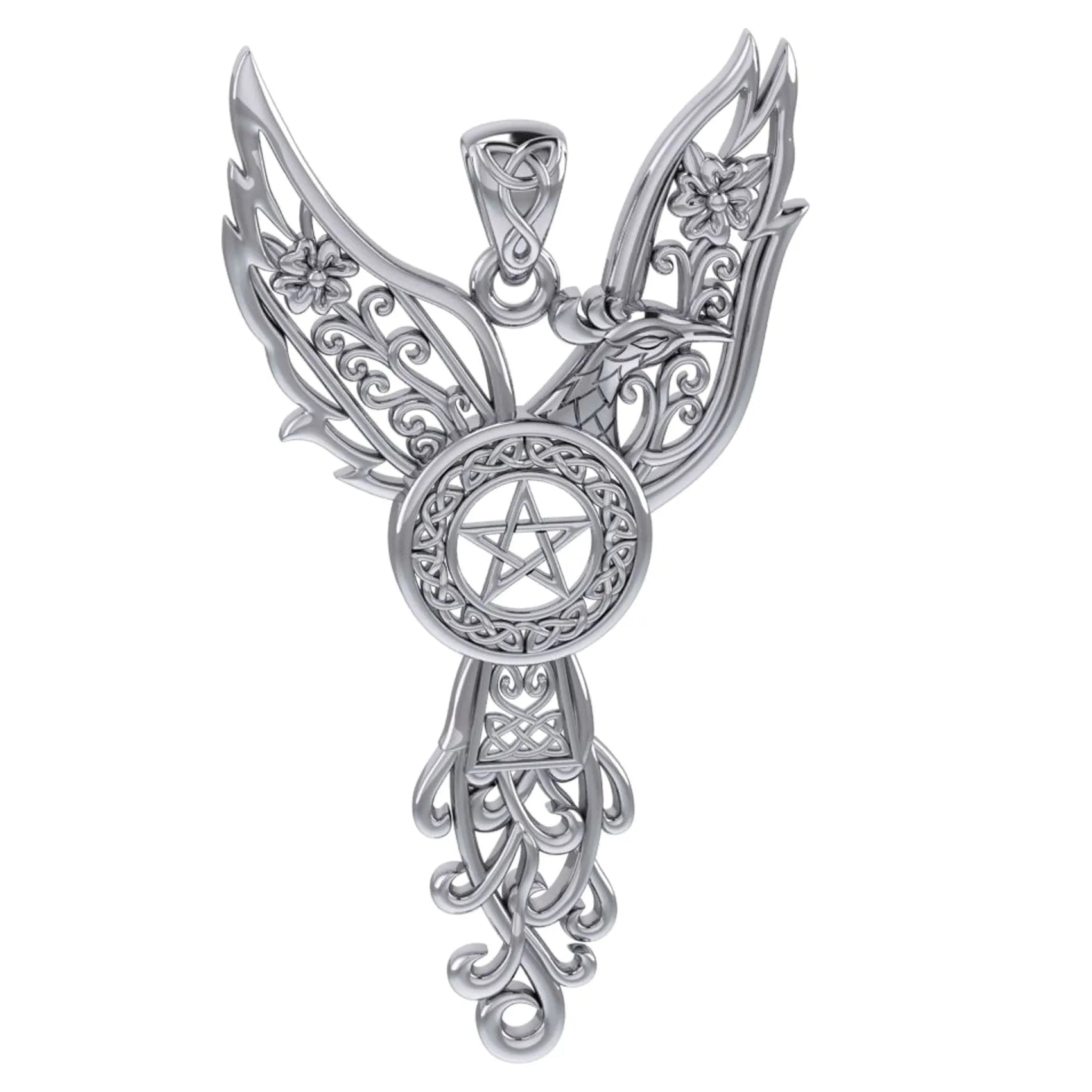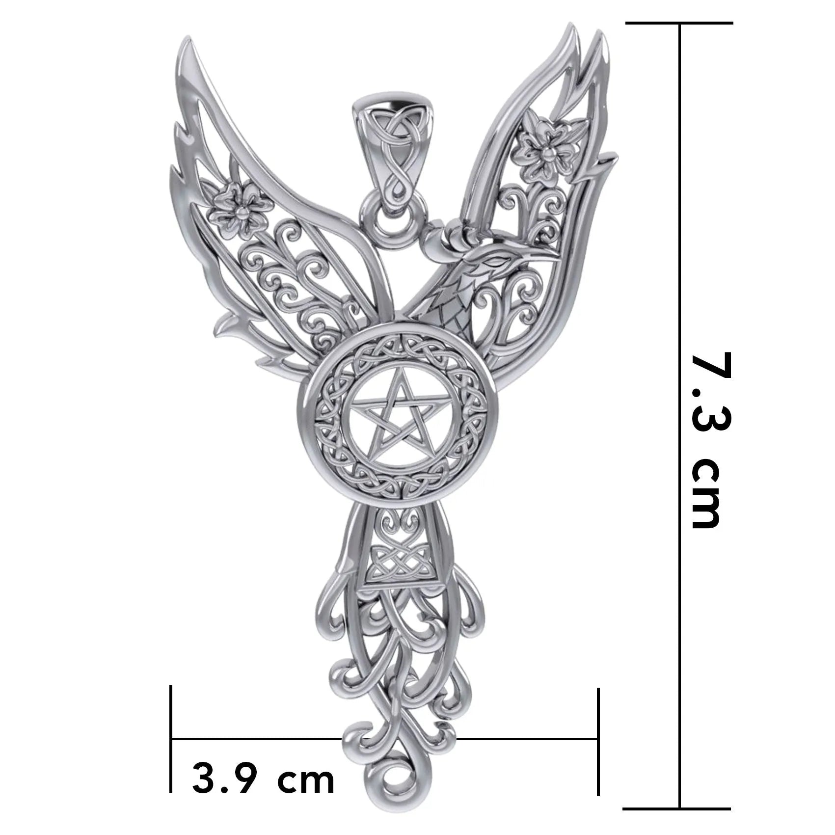 This extraordinary piece is cast in gleaming sterling silver, embodying both aerial grace and ancient spiritual protection. The design features the figure of a majestic Phoenix or Angel, its broad, stylized wings and lower body formed entirely of intricate Celtic knotwork and sweeping scroll details. This filigree work symbolizes eternity and the flow of the spirit.