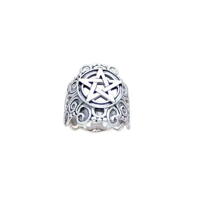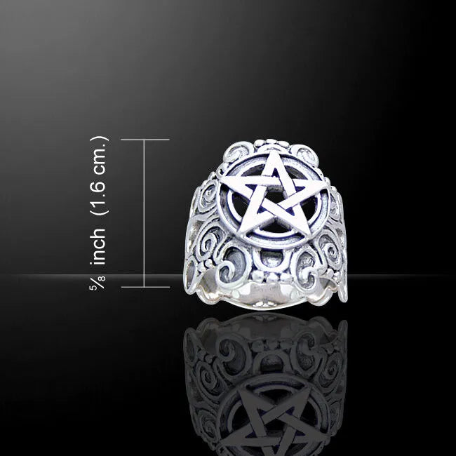 The Pentacle is framed by a highly decorative border and is set atop a wide, detailed band. The sides of the band showcase elaborate scrollwork and filigree patterns that evoke a sense of antique elegance and movement. The contrast between the clean lines of the Pentacle and the flowing, textural scrollwork creates a striking piece. This ring is a substantial and significant piece of jewelry, perfect for those who seek to wear a symbol of spiritual balance and protection with a lavish, handcrafted aesthetic.