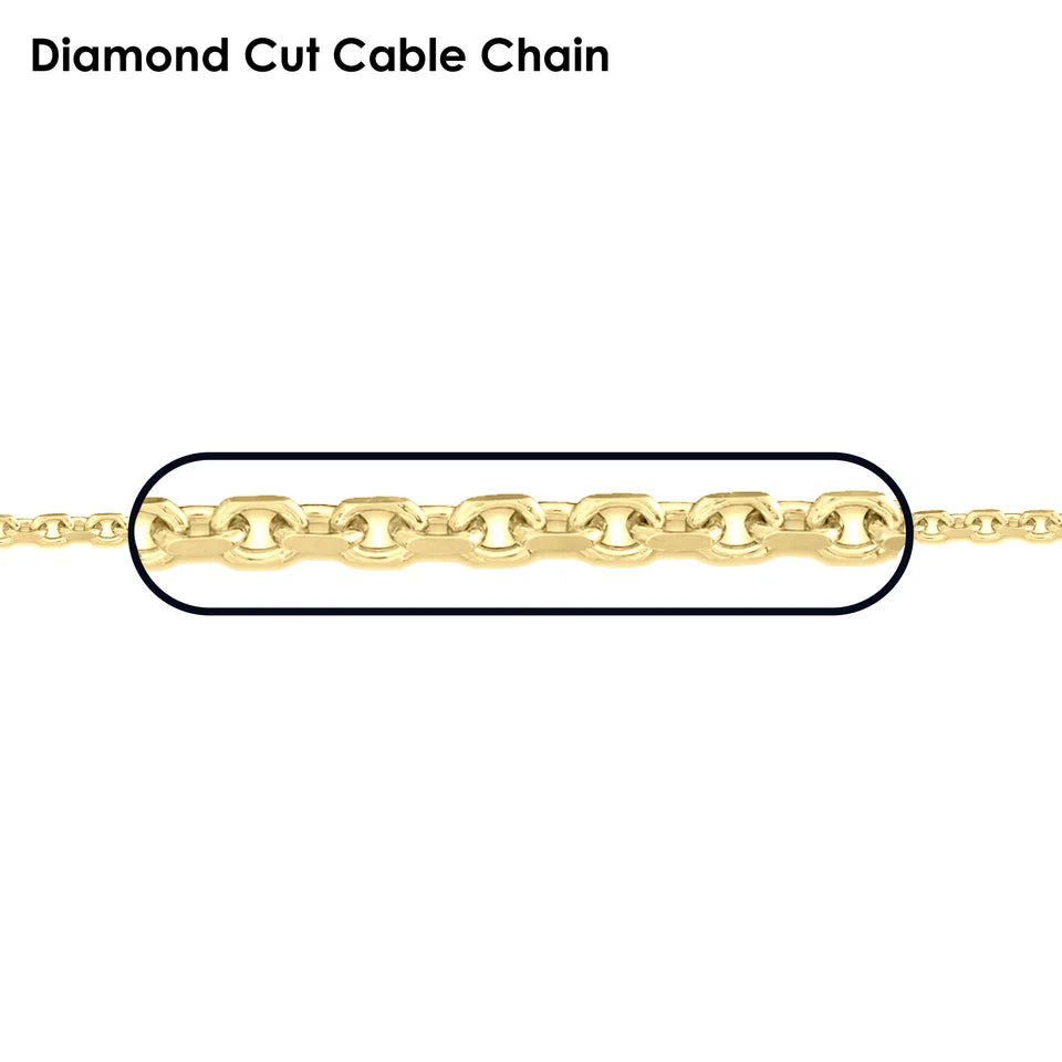 Add class to your outfit with this 14k yellow gold diamond cut cable chain necklace. Our 14K gold cable chains are solid and come with a lifetime warranty. They are available in sizes 1.5mm, 1.7mm, 2.2mm, 2.4mm & 3.0mm in lengths 16in thru 24in. Each chain fastens with a strong lobster claw clasp and is made with the highest quality gold alloy. Cable chains are known as a form of wire jewelry that has been around since the Egyptian Pharaohs! It is a very sturdy design that has lasted for millennia.
