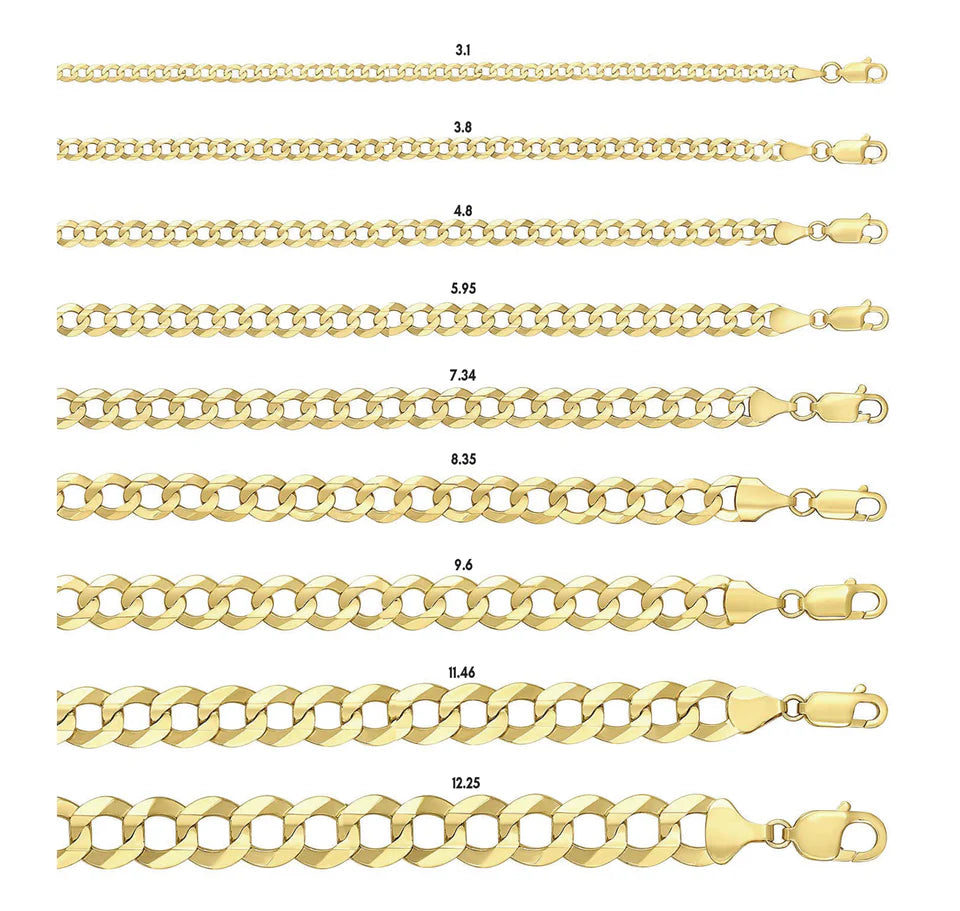 Explore our luxurious 14K yellow gold and white gold curb chains, available in 8 sizes from 3.1mm to 11.5mm. These exquisite chains are expertly crafted to offer both durability and elegance, making them the perfect accessory for any occasion. Whether you're looking for a classic piece to wear daily or a statement piece for special events, our gold curb chains provide timeless style and sophistication. Choose from a variety of sizes to find the perfect fit and enhance your jewelry collection with a touch of luxury."